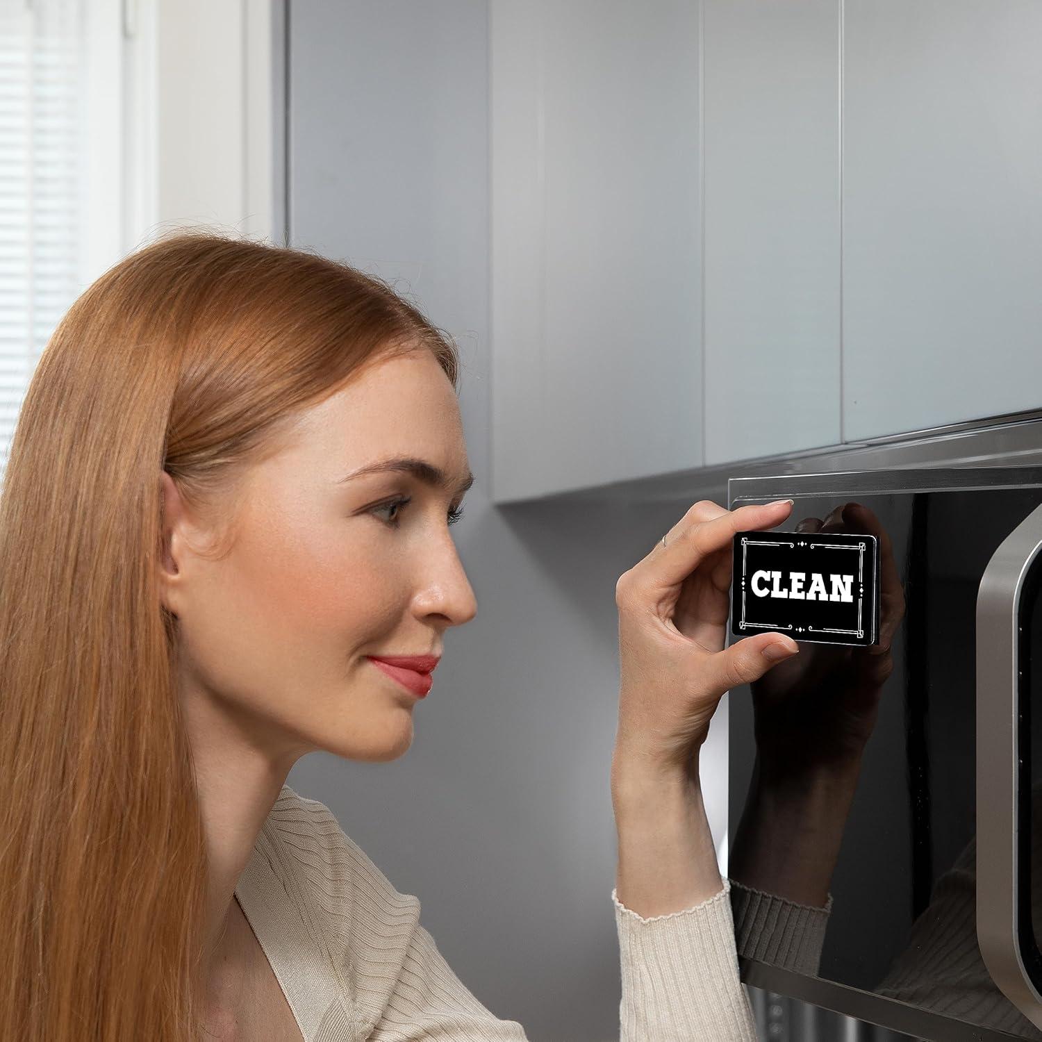 EASY TO USE AND STAYS IN PLACE. Adding this useful dishwasher dirty clean magnet sign to your dishwasher is easy: just stick it on to a magnetic surface or use the complimentary adhesive. You can also use this dishwasher sign clean dirty on the fridge, the toaster, or the microwave.
