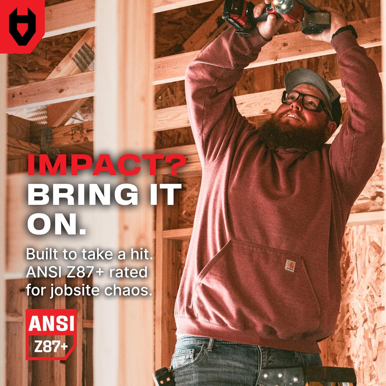 BUILT TO TAKE A HIT — These ANSI Z87.1 safety glasses shrug off flying debris with tough polycarbonate and built-in side shields that guard your blind spots. These impact resistant glasses are ready to handle high-impact situations, our clear safety glasses for men and women have a lightweight frame and slip-resistant temples.