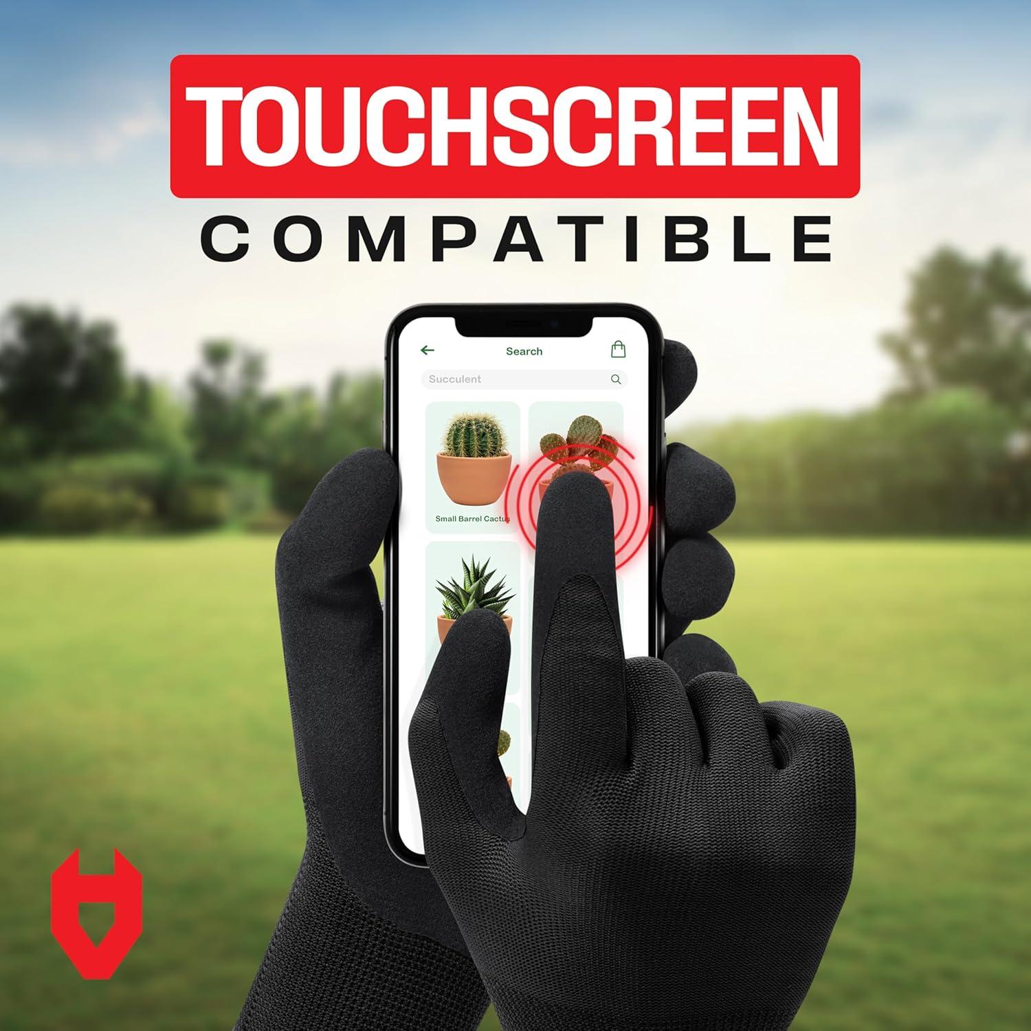 TOUCHSCREEN FINGERTIPS — Text, swipe, and type without taking your outdoor gloves off. And when you're done for the day, just toss these weeding gloves in the wash (68°F)—no need to hand-wash. Thanks to their quick-drying fabric, they’ll be ready for round two in no time.
