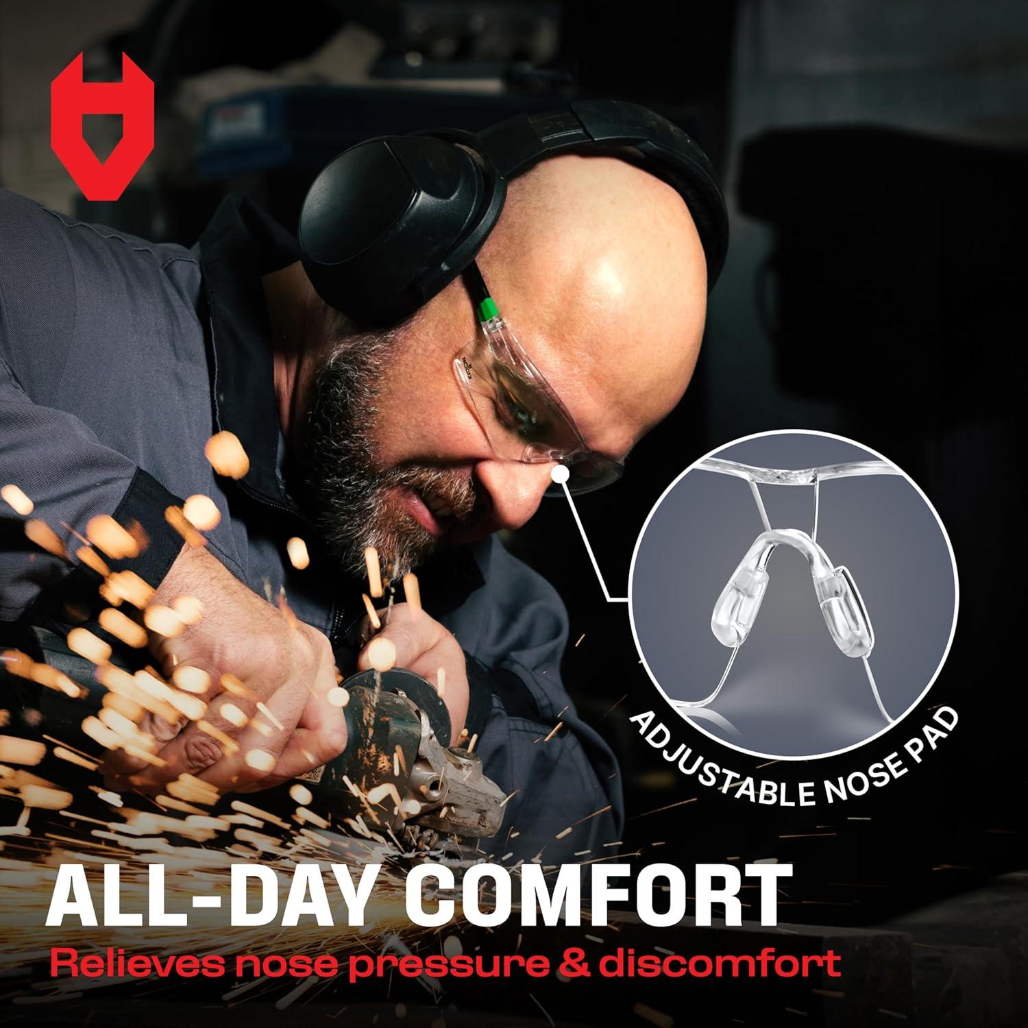 LIGHT, COMFORTABLE AND ADJUSTABLE — These clear eye protection glasses have extendable arms and an adjustable soft nose pad so you always get the perfect fit. They're also armed with non-slip rubber grips so your mens safety glasses stays on.