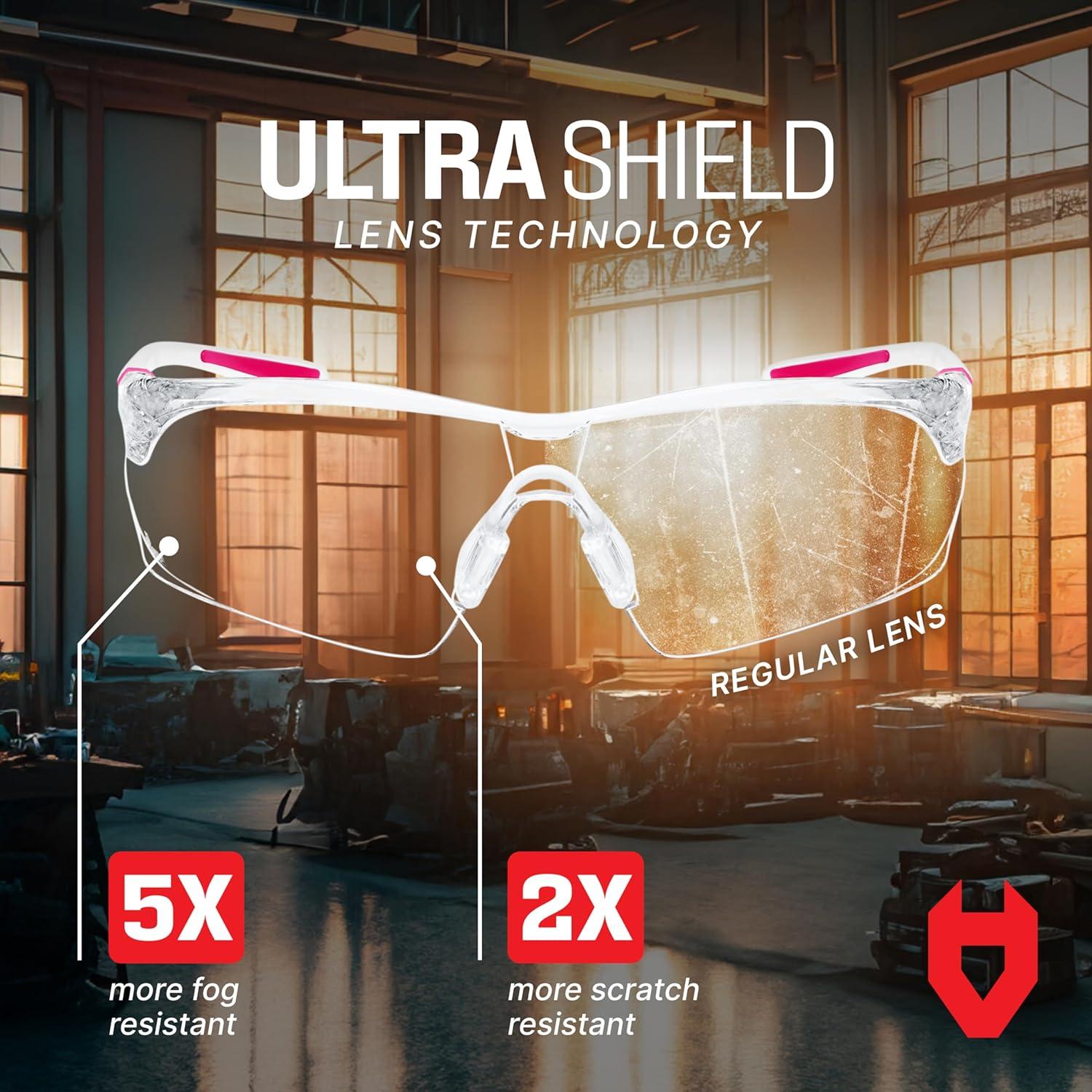 ULTRASHIELD LENS TECHNOLOGY — Compared to most clear protective glasses, the premium coating on our safety glasses anti fog is 5x more fog resistant and 2x more scratch resistant. No fog, no scratch, and zero optical distortion.
