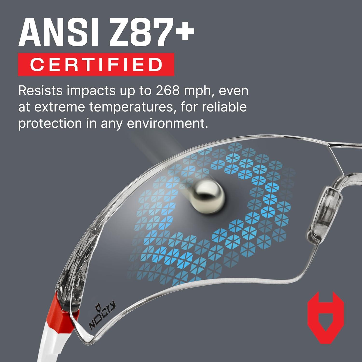 ULTRASHIELD LENS TECHNOLOGY — Compared to most clear protective glasses, the premium coating on our safety glasses anti fog is 5x more fog resistant and 2x more scratch resistant. No fog, no scratch, and zero optical distortion.