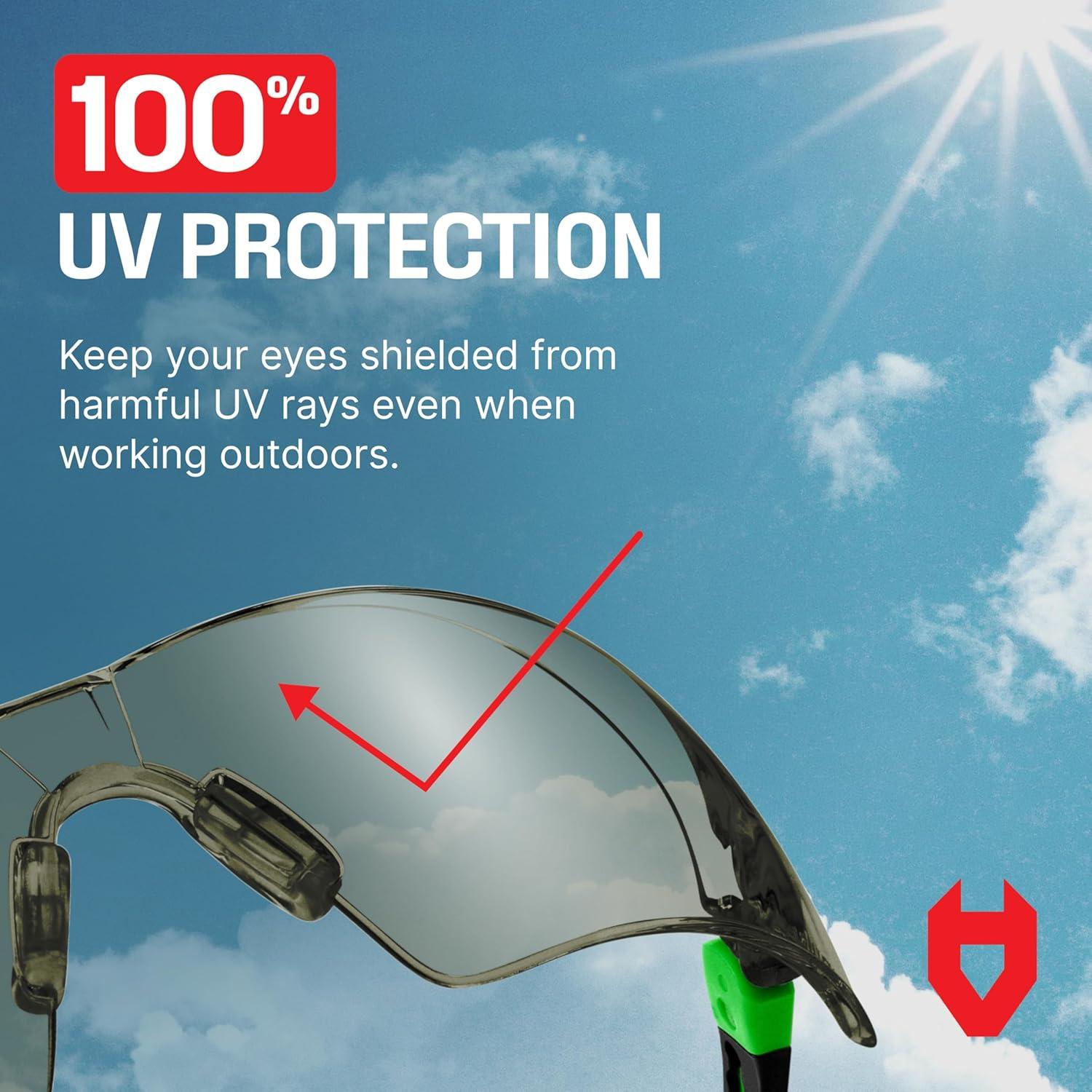 100% UV PROTECTION — Thanks to the green tinted lenses, these dark safety glasses block 85% of light. This decreases visual fatigue, and provides glare protection. And these construction sunglasses block harmful UV light too.