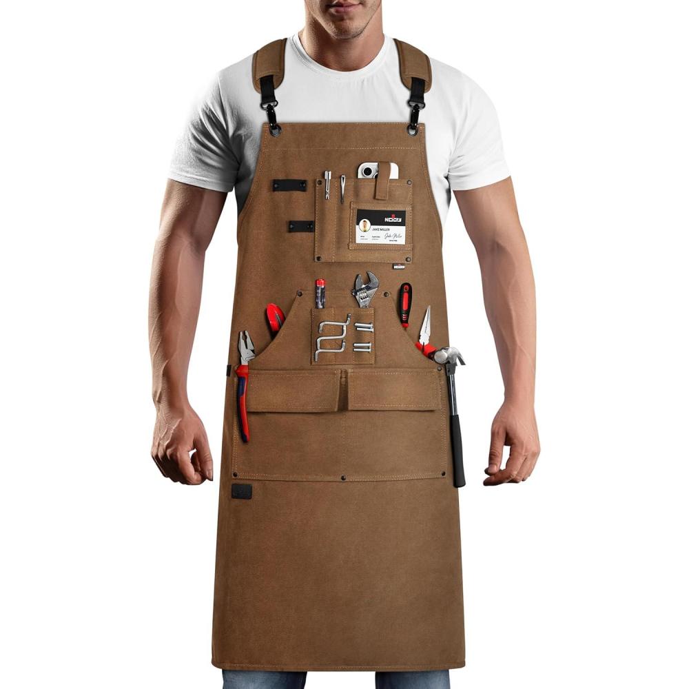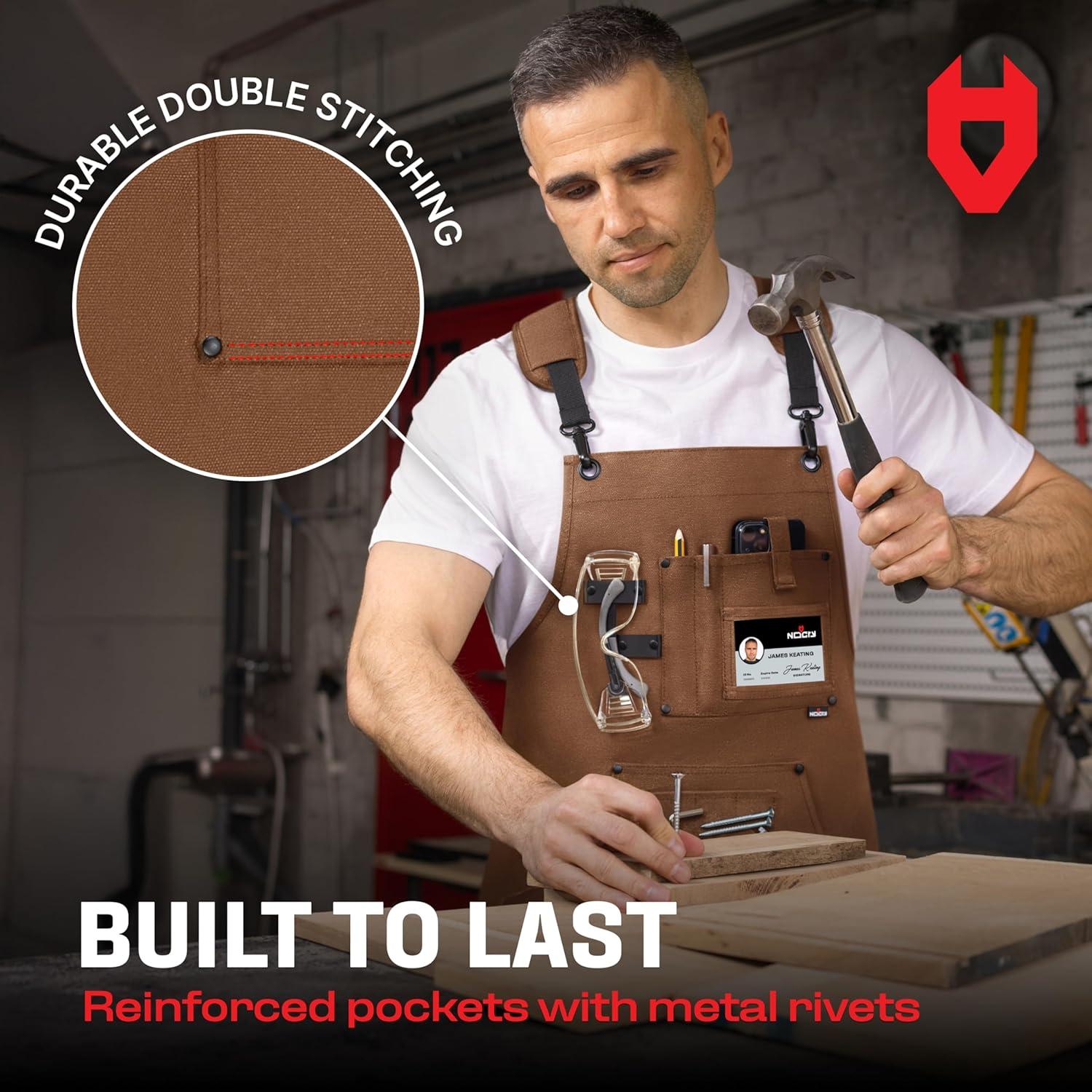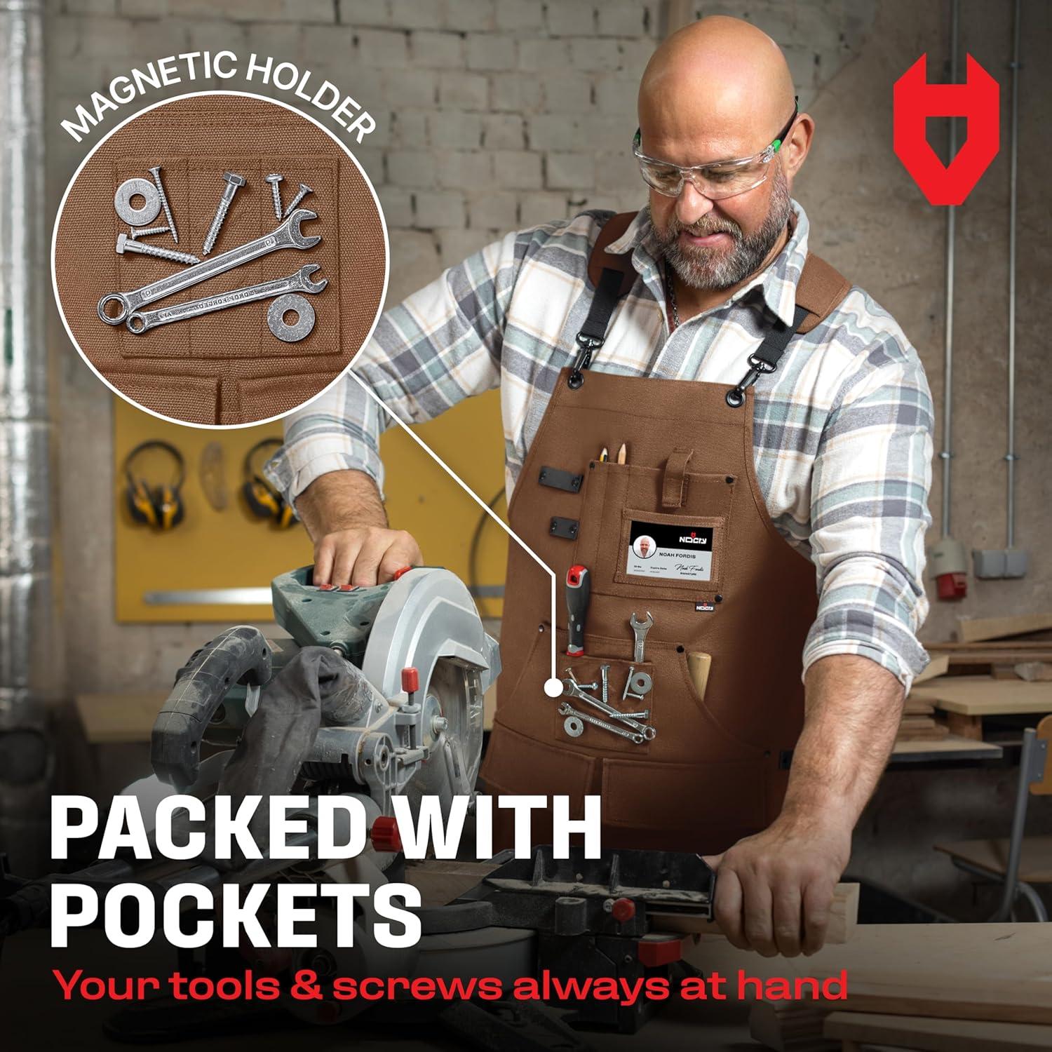 NoCry Woodworking Apron for Men — Reinforced Pockets with Metal Rivets, Magnetic Holder & Leather Tool Loops — Shop Aprons for Men with Cross-Back Straps, Non-Slip Shoulder Pads & Quick-Release Buckle(Brown)