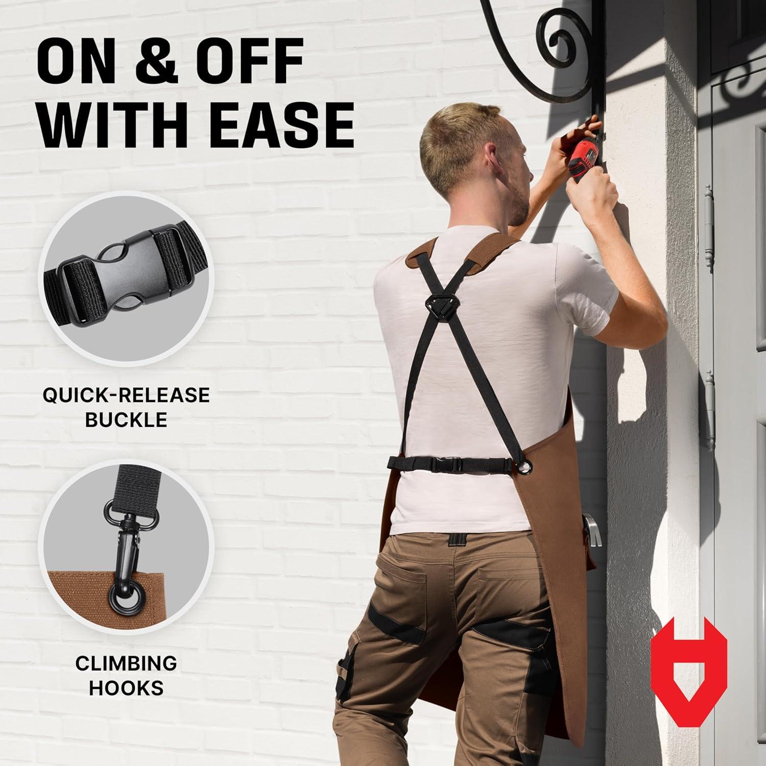 SAY GOODBYE TO NECK PAIN — Enjoy all-day comfort thanks to the cross-back straps on this carpenters apron for men, designed to eliminate neck strain. The anti-slip shoulder pads keep these shop aprons for men for wood working in place, so you can work without shifting or slipping.